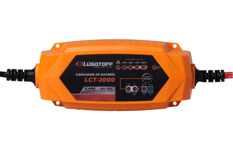Cargador inteligente Lusqtoff LCT-2000 35W para baterías de 12V, con diagnóstico automático y protección avanzada.
